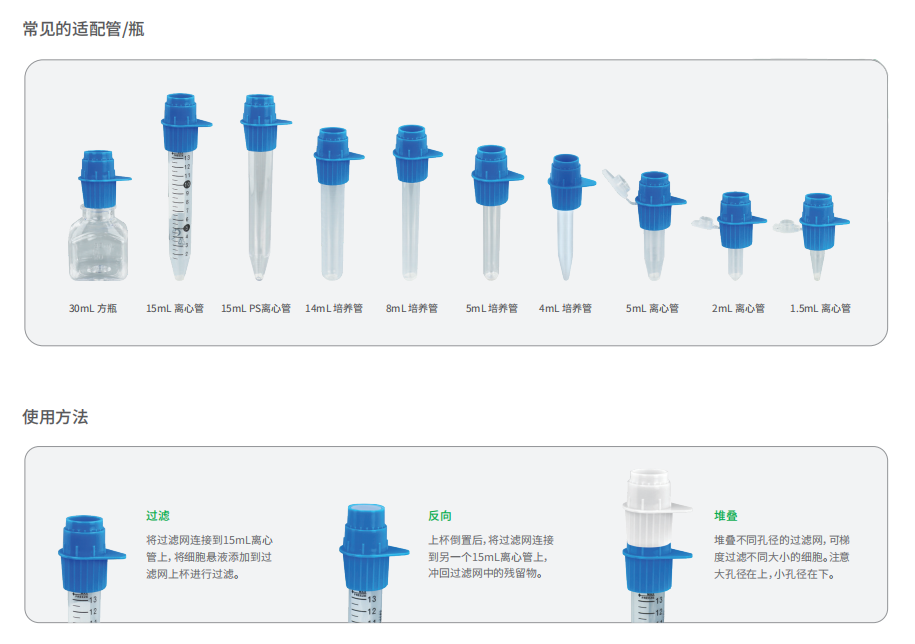 細(xì)胞過濾網(wǎng)是一種無菌篩分裝置,可快速地從細(xì)胞簇和組織中分離和過濾原代細(xì)胞,有效地去除細(xì)胞懸液中的細(xì)胞聚集體或大顆粒,以保證后續(xù)流式細(xì)胞術(shù)、細(xì)胞分選等實(shí)驗(yàn)的準(zhǔn)確性。