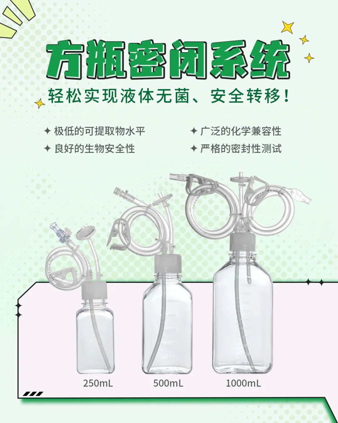 潔特生物新推出培養(yǎng)基方瓶密閉轉(zhuǎn)移系統(tǒng),可用于細(xì)胞治療、基因治療、抗體和疫苗等生物藥研發(fā)生產(chǎn)過程中的液體轉(zhuǎn)移,可實(shí)現(xiàn)全封閉式無菌液體轉(zhuǎn)移,最大程度降低污染風(fēng)險!