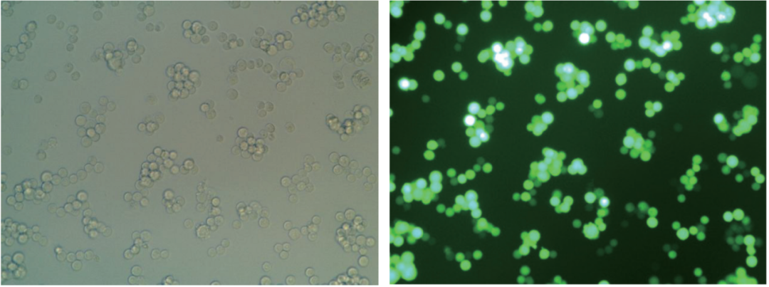 將4.0×106個/mL密度的HEK293細胞接種至ProGro™ 293 SFM,使用ProGro™ 293 TR 293細胞轉(zhuǎn)染試劑,轉(zhuǎn)染GFP基因質(zhì)粒,轉(zhuǎn)染48h后觀察細胞的轉(zhuǎn)染情況,轉(zhuǎn)染效率可達70-80%。
