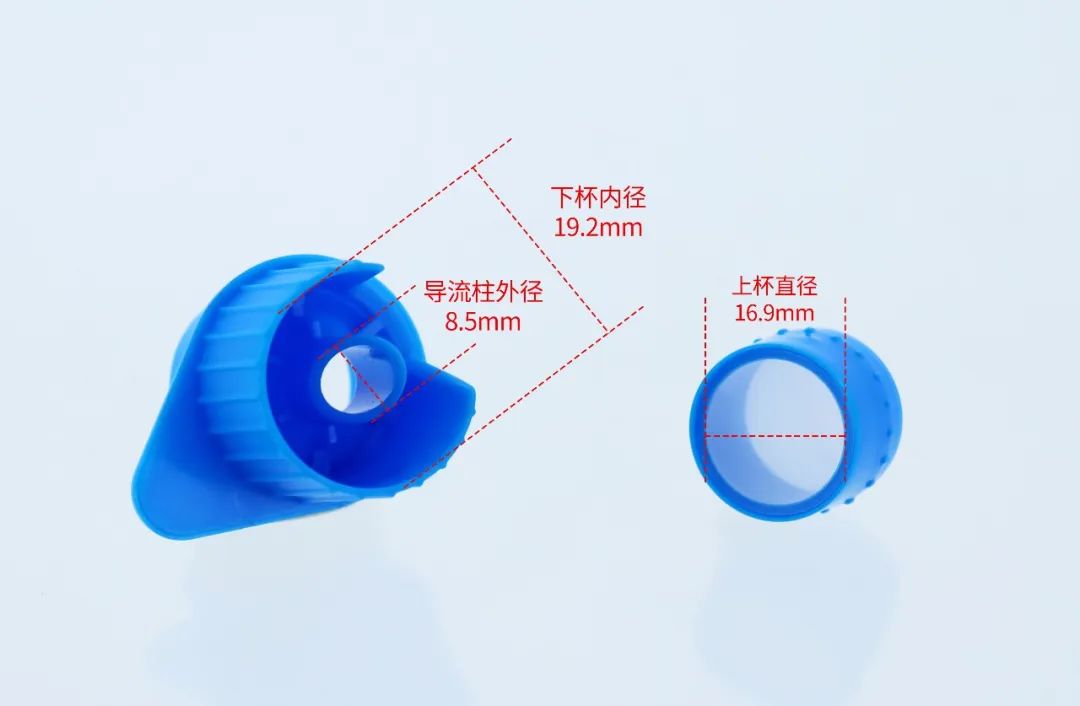 上下杯分體式設(shè)計(jì),濾網(wǎng)直徑16.9mm,下杯內(nèi)徑19.2mm,導(dǎo)流柱外徑8.5mm,適配最小內(nèi)徑大于9mm、最大外徑小于19mm的管/瓶口徑的1.5mL-15mL離心管、流式管、培養(yǎng)管等