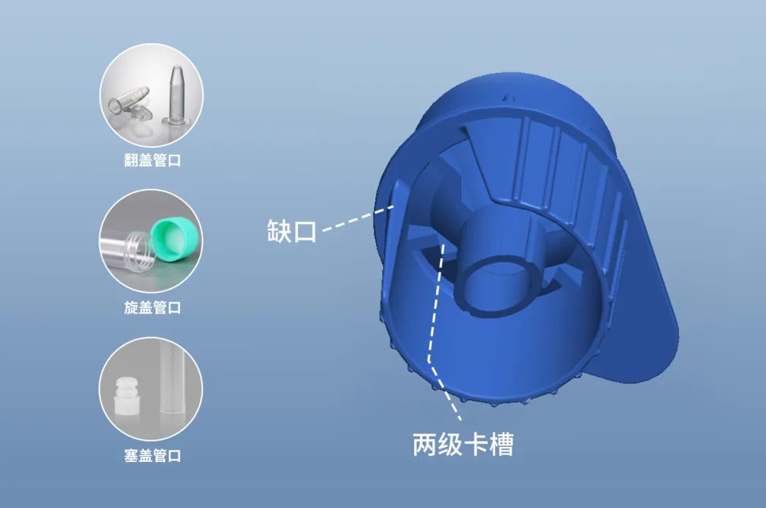 下杯缺口及兩級(jí)卡槽設(shè)計(jì),可穩(wěn)固適配旋蓋、翻蓋和塞蓋等多種管/瓶口