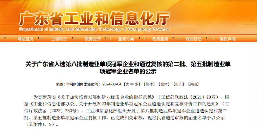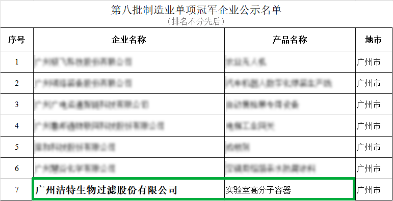 近日,廣東省工業(yè)和信息化廳發(fā)布了《第八批全國制造業(yè)單項冠軍企業(yè)》名單,廣州潔特生物過濾股份有限公司憑借生物實驗室耗材關鍵核心技術和先進生產(chǎn)工藝創(chuàng)新研發(fā)能力以及遙遙領先的市場占有率榮獲“制造業(yè)單項冠軍”。